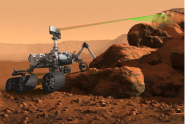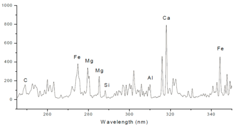 2012年美國火星探測車登陸火星對其進行現(xiàn)場勘測,采用LIBS遠距離分析儀。該儀器的脈沖激光器向數(shù)米至數(shù)十米的目標發(fā)射激光束,目標微區(qū)被激發(fā)產生等離子體光斑,然后用光譜儀記錄被激發(fā)原子退激產生的特征光譜線,對火星巖石或土壤進行元素組成分析。