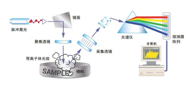 LIBS(Laser-induced breakdown spectroscopy)激光誘導擊穿光譜技術是光譜分析領域一種嶄新的分析手段,其基本原理是使用高能量激光光源,在分析材料表面形成高強度激光光斑(等離子體),使樣品激發(fā)發(fā)光,這些光隨后通過光譜系統(tǒng)和檢測系統(tǒng)進行分析。這種技術對材料中的絕大部分無機元素非常敏感,通過軟件算法可以對光譜進行進一步的定量分析。